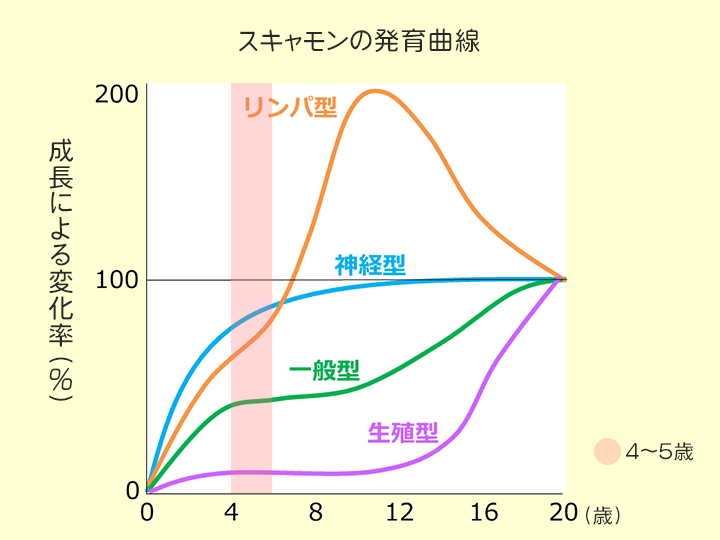 子供の発育・発達の過程を表しているスキャモンの発育曲線には、神経系型・リンパ系型、一般型、生殖器型と様々な分野の成長について記されていますが、その中の運動神経をつかさどる神経系型に注目をしています。 神経系型は、5歳までに80%の成長を遂げ、12歳までには、ほぼ100%まで成長するとされています。